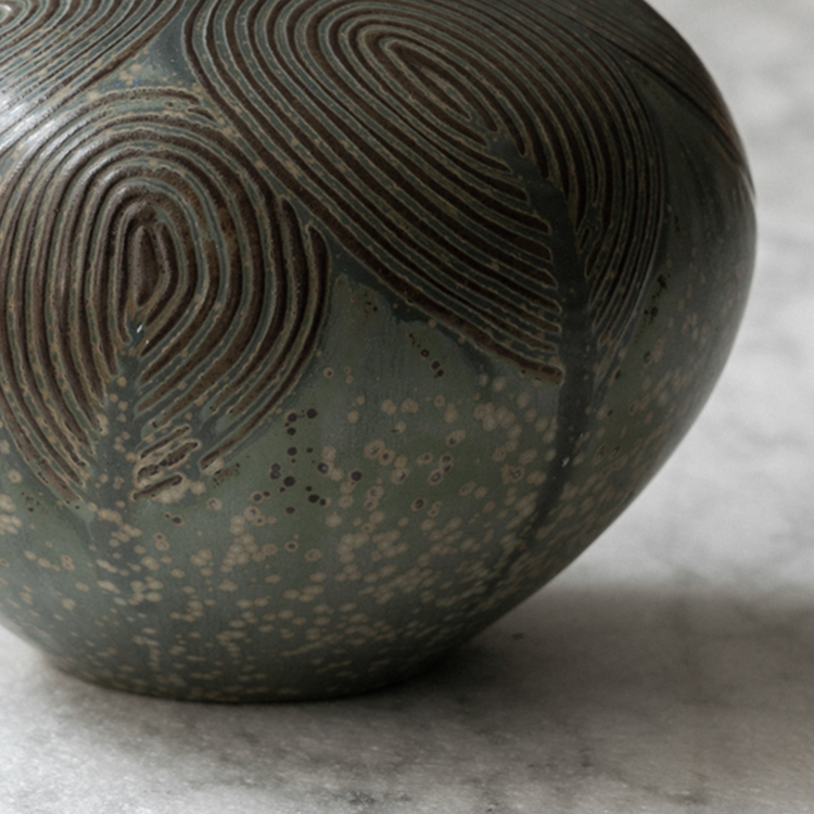 - Model 20738 rund vase (1940’erne) – dekoreret med bladmotiv i spirende stil, et typisk eksempel på Saltos fascination af naturens former og organiske vækst.