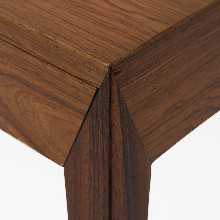Severin Hansens formsprog er arkitektonisk præcist og radikalt minimalistisk – med vægt på klare geometrier, slanke dimensioner og absolut håndværksdisciplin. Signaturen er den tre-vejs geringssamling (fra 1958) og den afrundede variant (1964), udført i ædle træsorter som teak, palisander og mahogni. Helheden fremstår grafisk ren, næsten “søm- og samlingsløs”, men er teknisk ekstremt krævende – et stiltræk, der gør hans borde og skriveborde let genkendelige blandt Danish Modern-klassikerne.